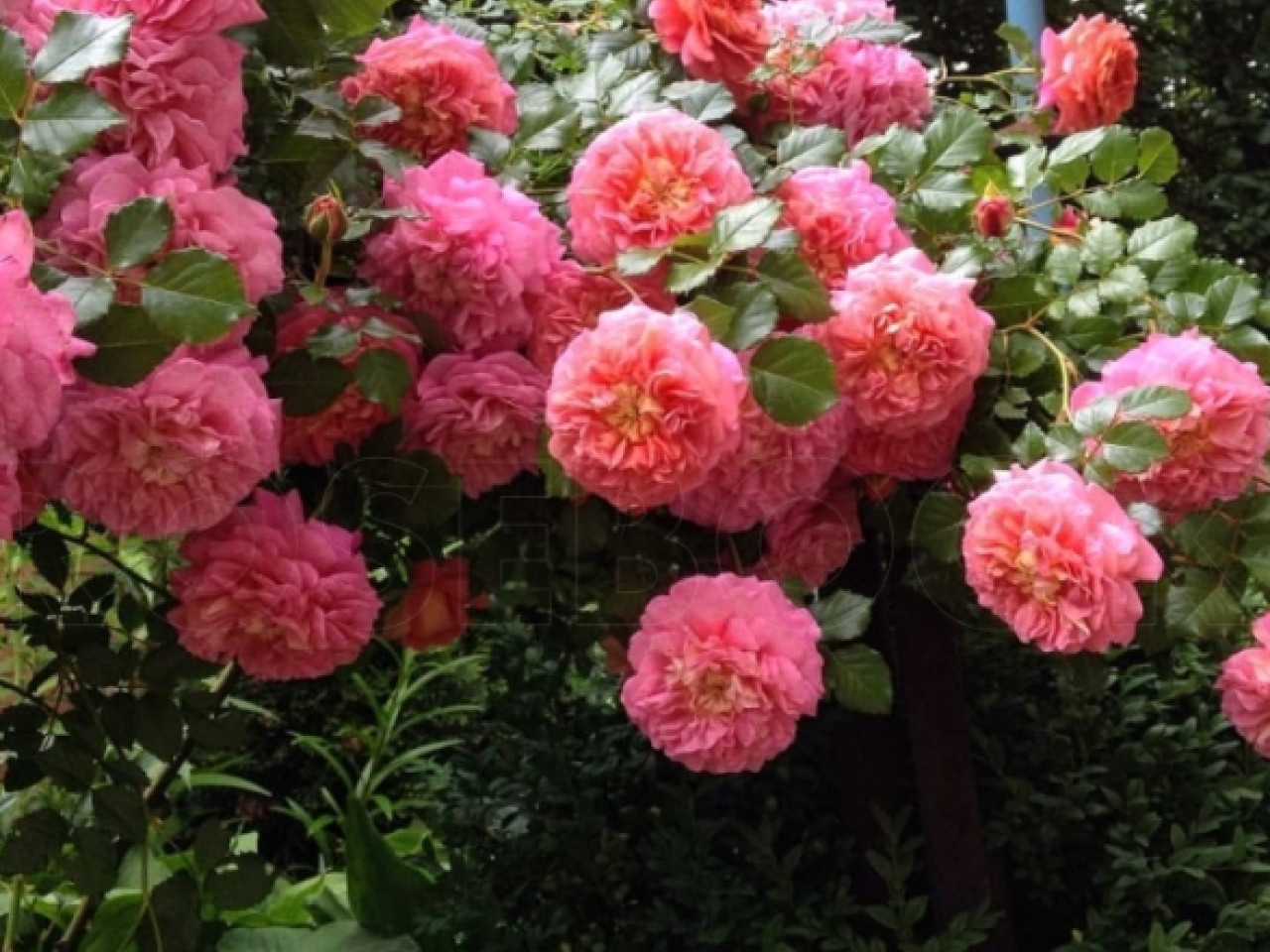 Цветки густомахровые, чашевидные, 7–9 см в диаметре, собраны в соцветия по 3–5 бутонов. Оттенки варьируются — от оранжево-алых и лососевых до розово-золотистых, а внутренние лепестки часто имеют солнечно-жёлтый центр, что создаёт эффект внутреннего свечения.